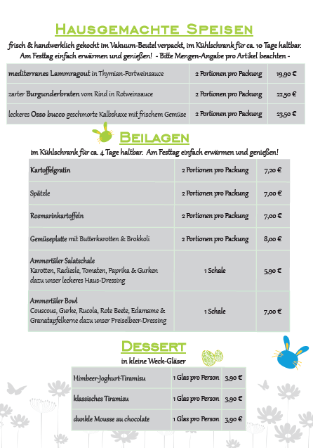 - Bitte vermeiden Sie Stornierungen und Umbestellungen einzelner Artikel oder Abholtage. Dies erleichtert unseren Ablauf enorm.